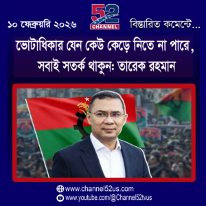 ‘আগামী ১২ ফেব্রুয়ারি অনুষ্ঠিত হতে যাচ্ছে জাতীয় নির্বাচন। এই নির্বাচন বাংলাদেশের বহু প্রতীক্ষিত নির্বাচন। এই নির্বাচনে বাংলাদেশের মানুষ তাদের পছন্দমতো এবং শান্তিপূর্ণভাবে ভোট দিতে পারবে’—এমন প্রত্যাশার কথা জানিয়েছেন বাংলাদেশ জাতীয়তাবাদী দলের (বিএনপি) চেয়ারম্যান তারেক রহমান। একই সঙ্গে ভোটাধিকার যেন কেউ কেড়ে নিতে না পারে, সে বিষয়ে সবাইকে সতর্ক থাকারও আহ্বান জানিয়েছেন তিনি।